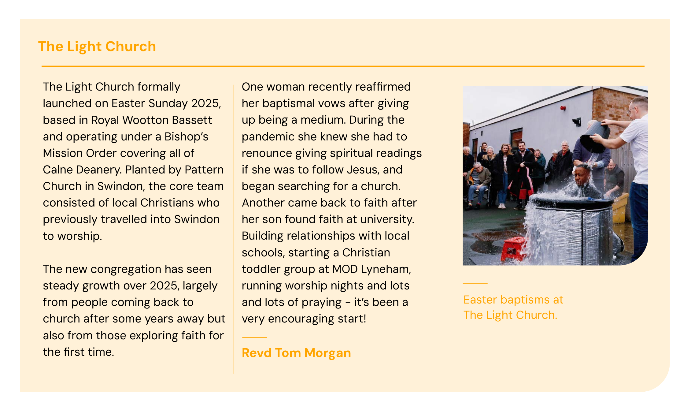 The first mission designs for the hubs – which will partner and support surrounding churches – were approved in 2025, with work continuing to finalise remaining plans in early 26. While each hub reflects its local context, all share a commitment to deepening discipleship and engaging more children and young people. Through external funding, we have supported the launch of The Light Church in Royal Wootton Bassett, establishing a new church plant for families previously travelling out of the diocese to worship (see case study below).