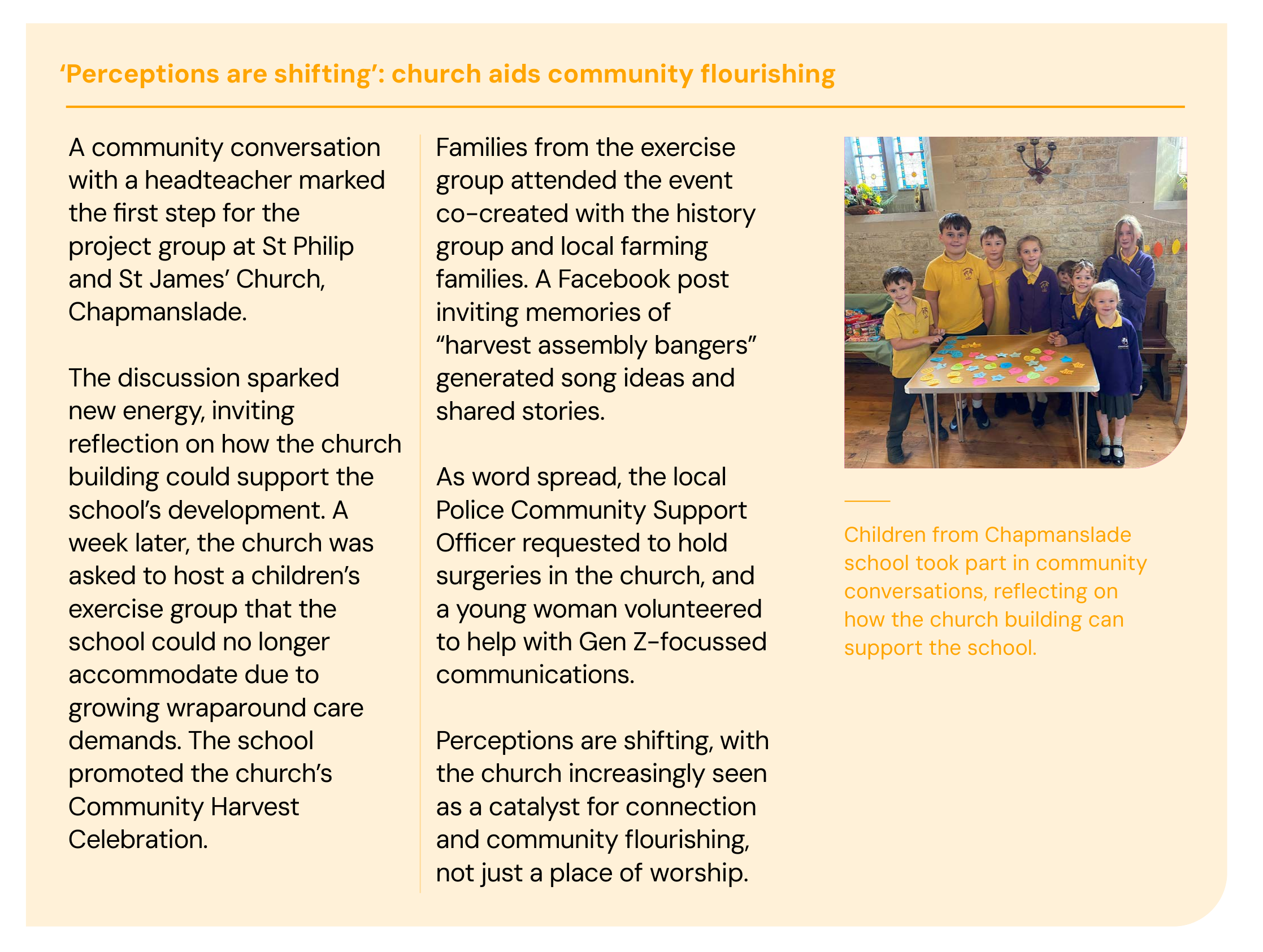As part of a two-year Buildings for Mission project exploring sustainable futures for church buildings, Toni Bush has worked with twenty-five churches and two deaneries. In response to challenges around volunteer capacity and finances, churches have been introduced to an Asset-Based Community Development (ABCD) approach, focusing on mobilising local strengths to enable meaningful change. ABCD reframes engagement from doing things to and for communities towards working with them. Toni is leading pilot transformation projects in four churches, developing shared missional visions for church buildings alongside local partners. The impact is clear: stronger relationships, co-created events and more creative, diverse use of buildings. Churches are becoming more active, connected and resilient at the heart of their communities.